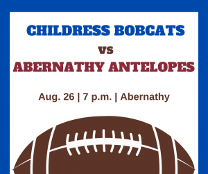 The Childress Bobcats play Abernathy in the season opener at 7 p.m. Friday, Aug. 27. If you aren’t at the game, you can keep up with it on The Childress News Facebook page.