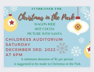 He will be at the fundraiser for Christmas in the Park at 6 p.m. on Saturday, Dec. 3. In addition to pictures with Santa, there will be hot cocoa and wagon rides through the park.