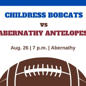 The Childress Bobcats play Abernathy in the season opener at 7 p.m. Friday, Aug. 27. If you aren’t at the game, you can keep up with it on The Childress News Facebook page. I’ll post updates and big plays as they happen and will keep you informed on the score! You can follow us for game…