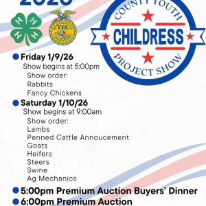 The Childress County Youth Project Show (CCYPS) is this Friday, Jan. 9 and Saturday, Jan. 10 at the Mashburn Event Center. “We will roughly have 35 head of hogs, 10 lambs, 6 goats, about 8 head of cattle and several chickens and rabbits,” Childress County Extension Agent for Ag and Natural Resources Cory Whitaker said.…