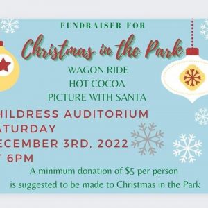 CHILDRESS – Santa Claus is coming to town! He will be at the fundraiser for Christmas in the Park at 6 p.m. on Saturday, Dec. 3. In addition to pictures with Santa, there will be hot cocoa and wagon rides through the park. “The park is looking much better,” Christmas in the Park committee member…