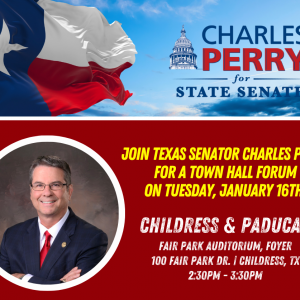 CHILDRESS – Texas State Sen. Charles Perry will host a town hall at 2:30 p.m. on Tuesday, Jan. 16 at the Fair Park Auditorium after he meets with the Western Rolling Plains Republican Women. “As we kick off 2024, I look forward to spending time in the district talking to my constituents about our legislative…
