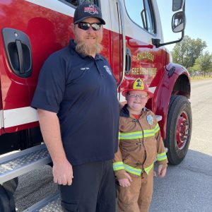 CHILDRESS – Fire Prevention Week is a big event for Childress Elementary School students like McCrae Detwiler. He placed third in the first grade poster contest and got to ride on the fire truck to the pizza party for contest winners at the Fair Park Pavillion. Detwiler even sported a firefighter outfit. “I’m going on…